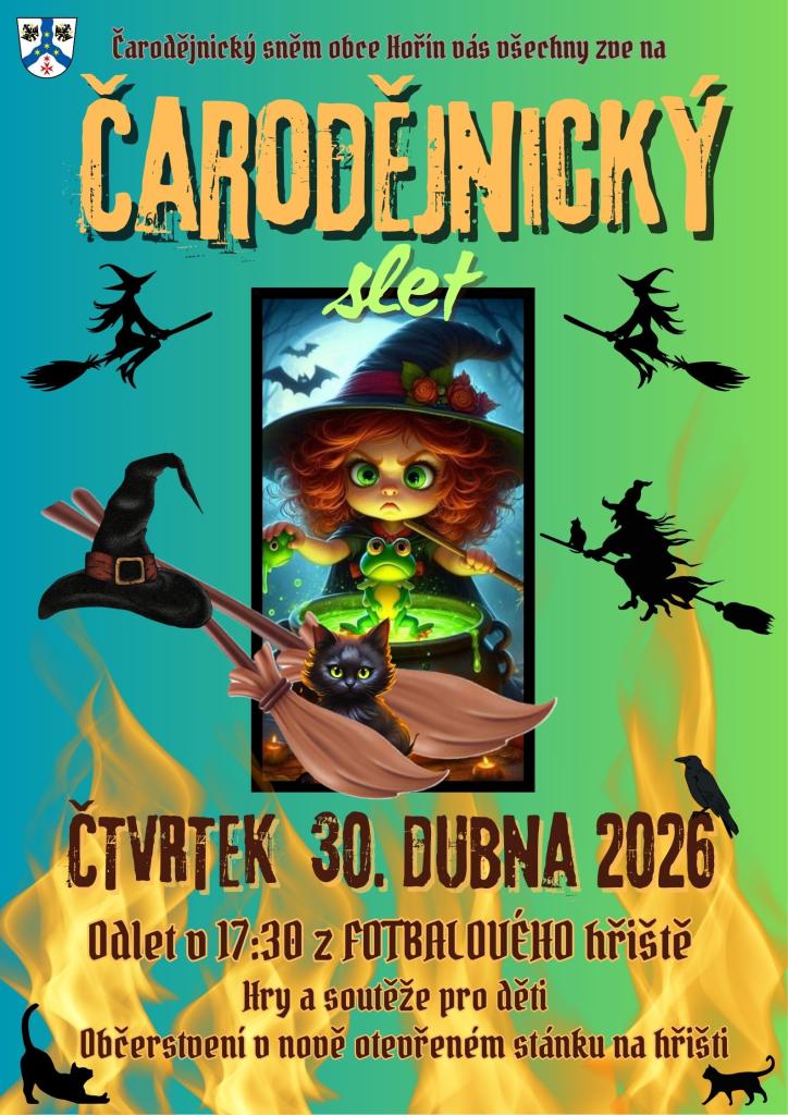 Čarodějnický sněm obce Hořín vás všechny zve na ČARODĚJNICKÝ SLET. Odlet bude v 17:30 z fotbalového hřiště. Hry a soutěže pro děti. Občerstvení v nově otevřeném stánku na hřišti.